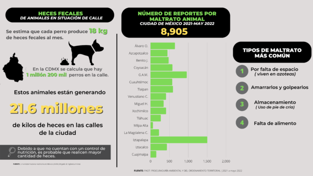 Uno de ellos son las heces fecales de perros que hay en las calles de nuestra ciudad, y solo para poner en contexto y podamos dimensionar el grave problema de salud al que nos enfrentamos, les comparto estas gráficas que nos permiten darnos cuenta el impacto que tiene que los animales defequen en las calles, el número de denuncias por alcaldía y el tipo de denuncias.